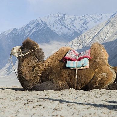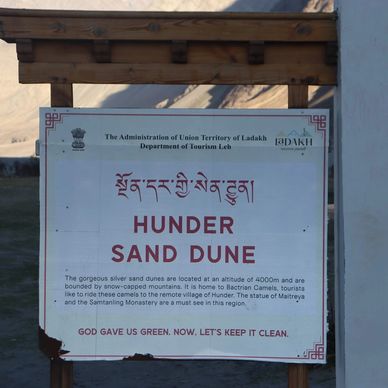 Hunder is a small village located about 7 km from Diskit in the Nubra Valley, at an altitude of roughly 10,000 feetabove sea level. It is famous for its cold desert landscape, complete with rolling sand dunes, Bactrian (double-humped) camels, and the Shyok River flowing beside it.